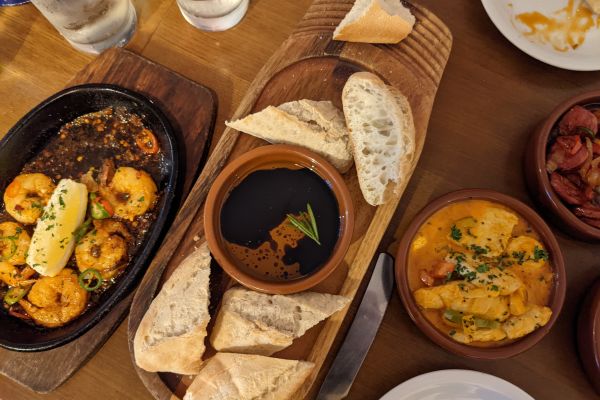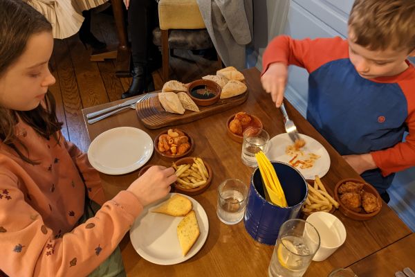 One of the best things we enjoyed about the meal is that it gave my older two a chance to try new things because we’d ordered such a selection of tapas. So they shared our Chorizo, padron peppers and paprika chicken. Those were a step too far for the little one though who was very content eating his fries!