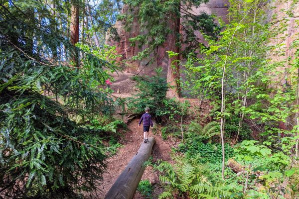 We spent a long time just playing amongst the quarries from here onwards, on a summer’s day the orange of the sandstone rock against the blue sky and giant redwoods were beautiful.