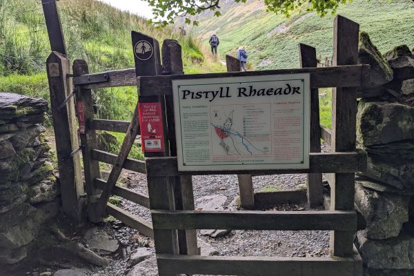 To start the walk to the top of the falls, walk to the gate entrance of the car park and take a path on your left hand side, follow this through the woods (you can also access this path from turning right on the metal bridge at the base of the falls as you’re looking at them). A few metres past the below gate, you’ll leave the woods and enter into the open valley.