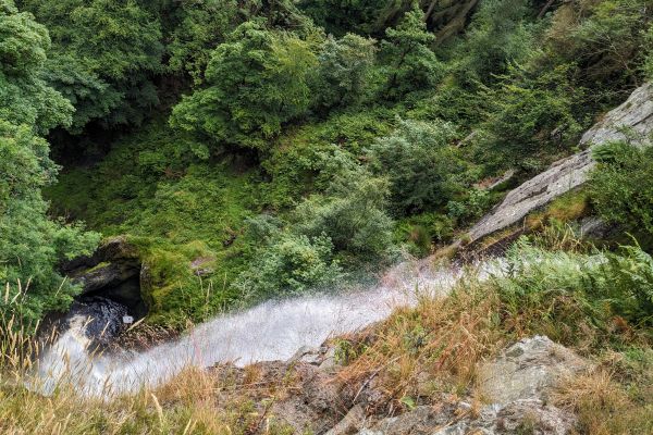 From where the paths meet, keep walking, the path will then go downhill to re-enter the woods. Pass through the style and follow the path down towards the top of the falls.